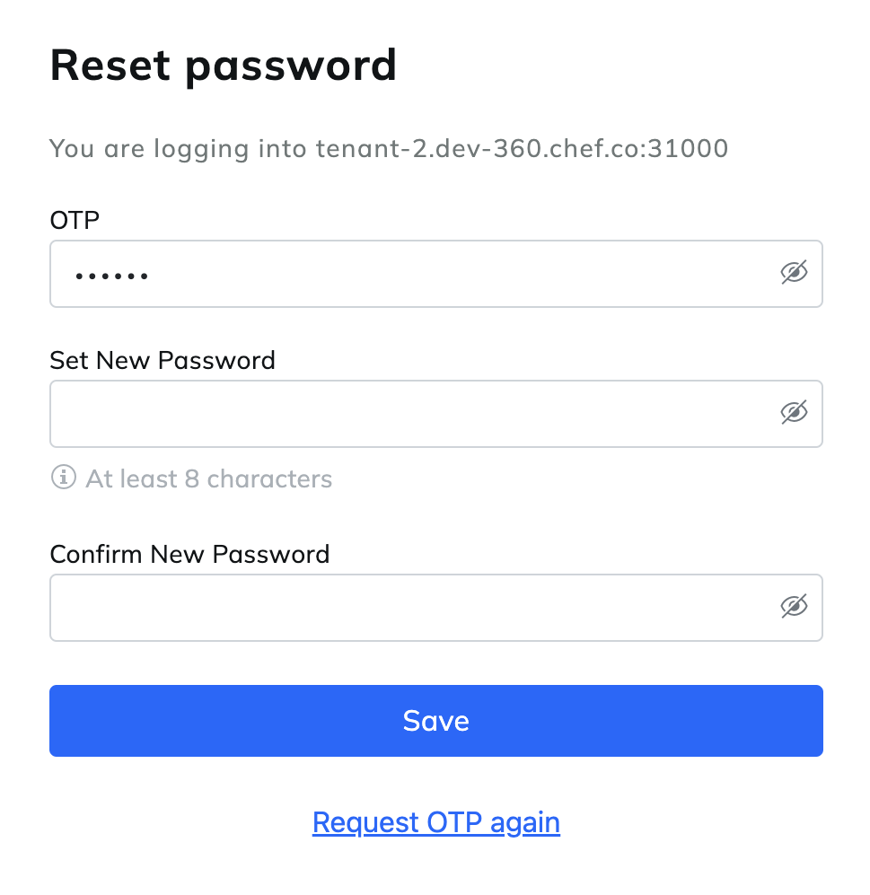 Open the link from the email sent by Chef 360 Platform. In set your new password with at least eight characters.
